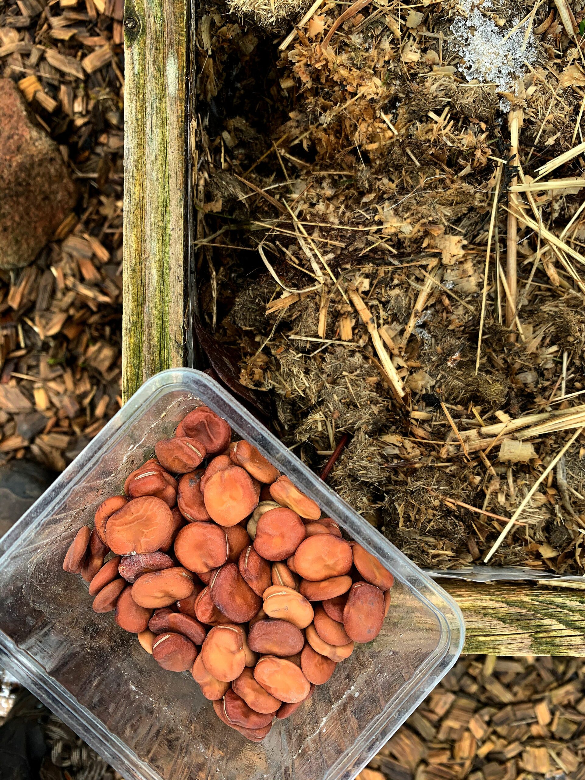 Jag sår årets vintersådd av bondbönor i en odlingslåda som är täckt med hästgödsel. Lådan mäter 120cm x 120cm.