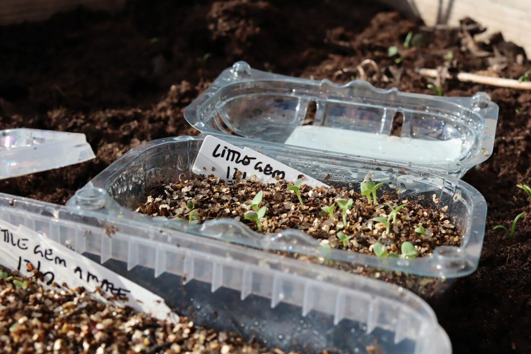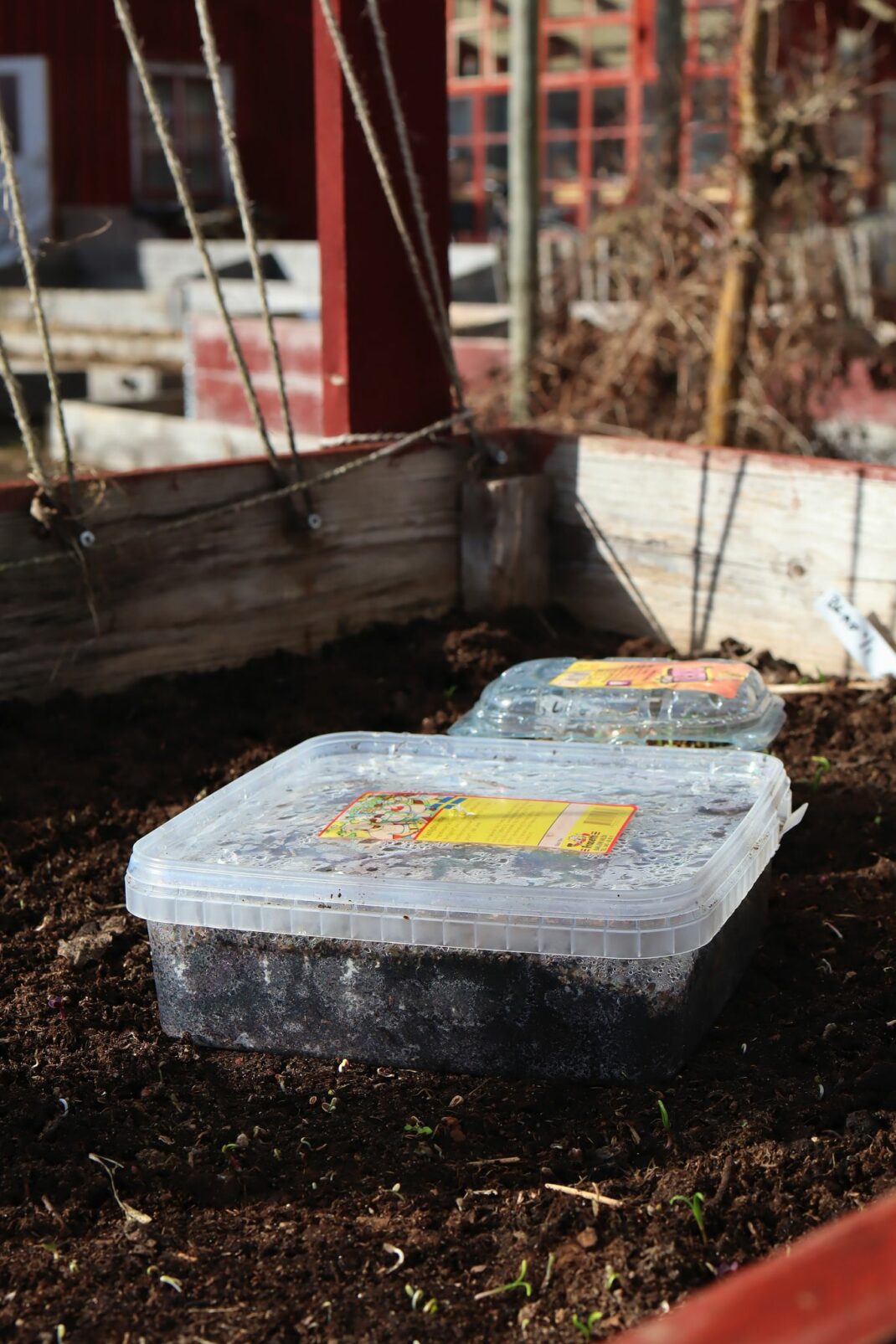 Den här pallkragen är täckt med ett lock, som ger extra värme till jorden och sådden som står ovanpå.