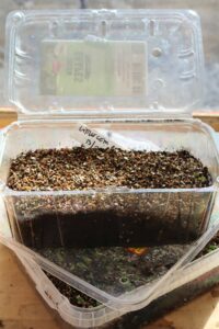 12. mars 2026I ett av trågen har det grott långsammare i växthuset, men fröerna tittar upp jämnt fördelat över ytan här med.