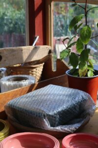 Den färdiga sådden har täckts med bubbelplast och står i på en bänk i växthuset nu.