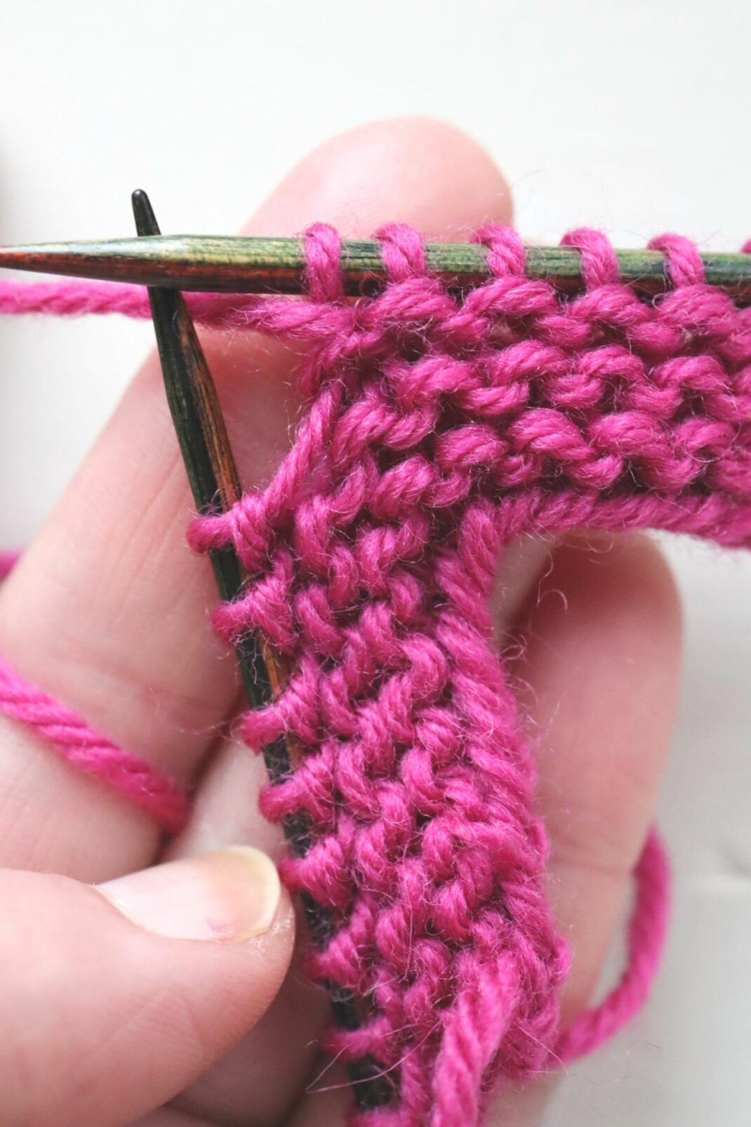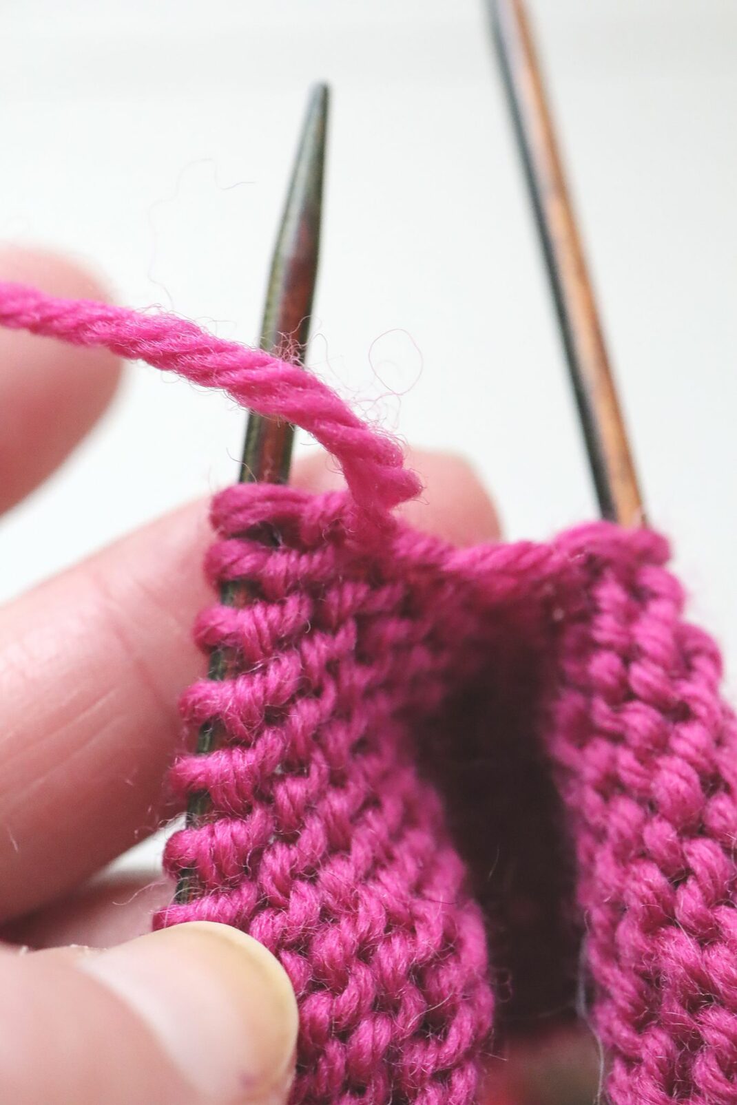 12. Väl på höger sticka dras garnet lätt bakåt, så att det ser ut som om två maskor bildas. Därefter stickas arbetet vidare i aviga maskor.