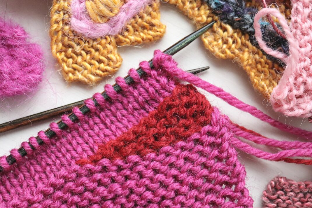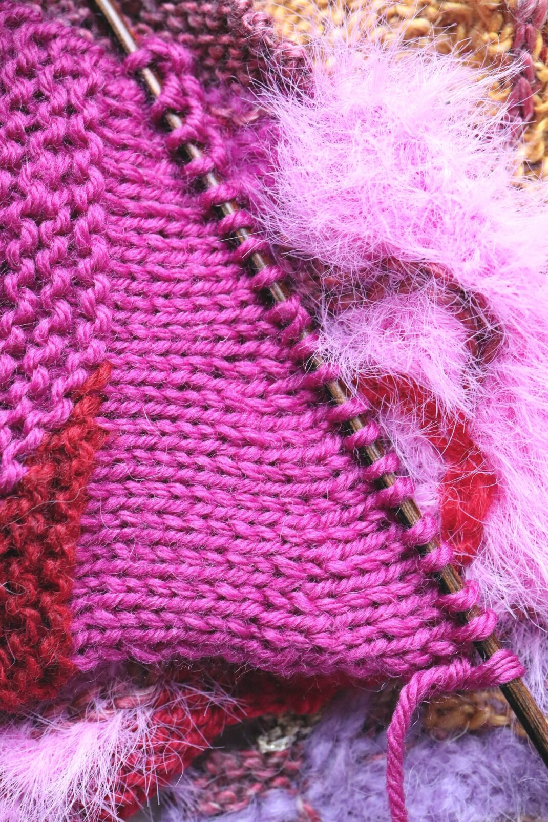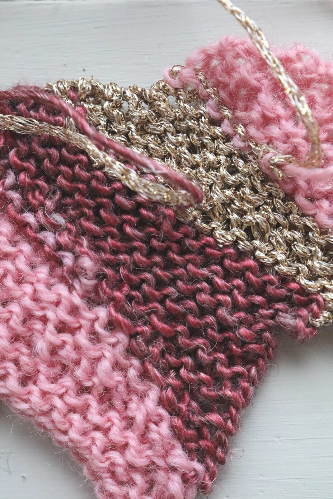 Ta ett garn och ett par korta stickor för att prova själv! Du kommer snart att få snits på det och kanske vilja prova att göra mer. Om du vill göra något liknande som jag gjort kan du tänka på att göra garnbytet i mitten av varvet och lämna ändarna längre än vanligt. Fäst sedan ändarna genom att använda en stoppnål för att göra tjusiga stygn eller virka en form på rätsidan. En enda kul form med flera garner blir raskt en finurlig handledsvärmare - om du inte har tålamod att göra ett helt större plagg.