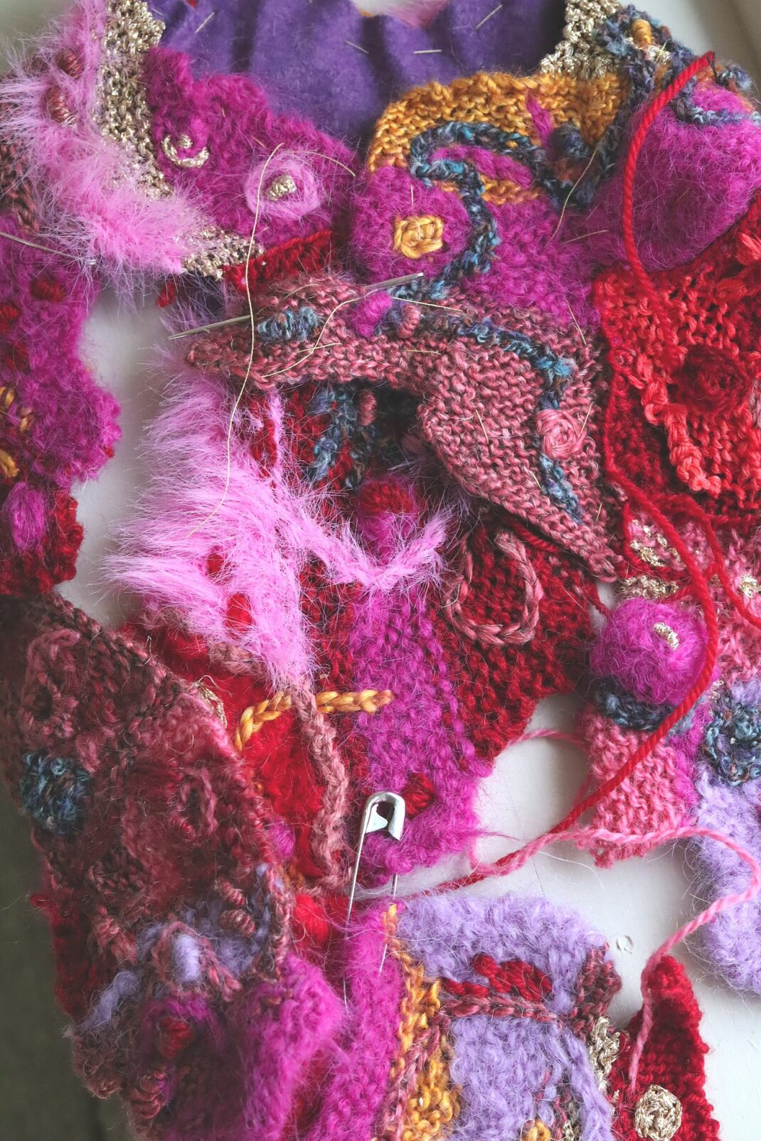 Just nu håller jag på att sticka de sista delarna i min läckra rosa frihandsstickade kofta i blandade garner. Jag har stickat på koftan i över ett år. Plagget består av cirka 200 mindre delar som sammanfogas till större partier och sedan ges dekorationer när trådändarna broderas och virkas över sticket.