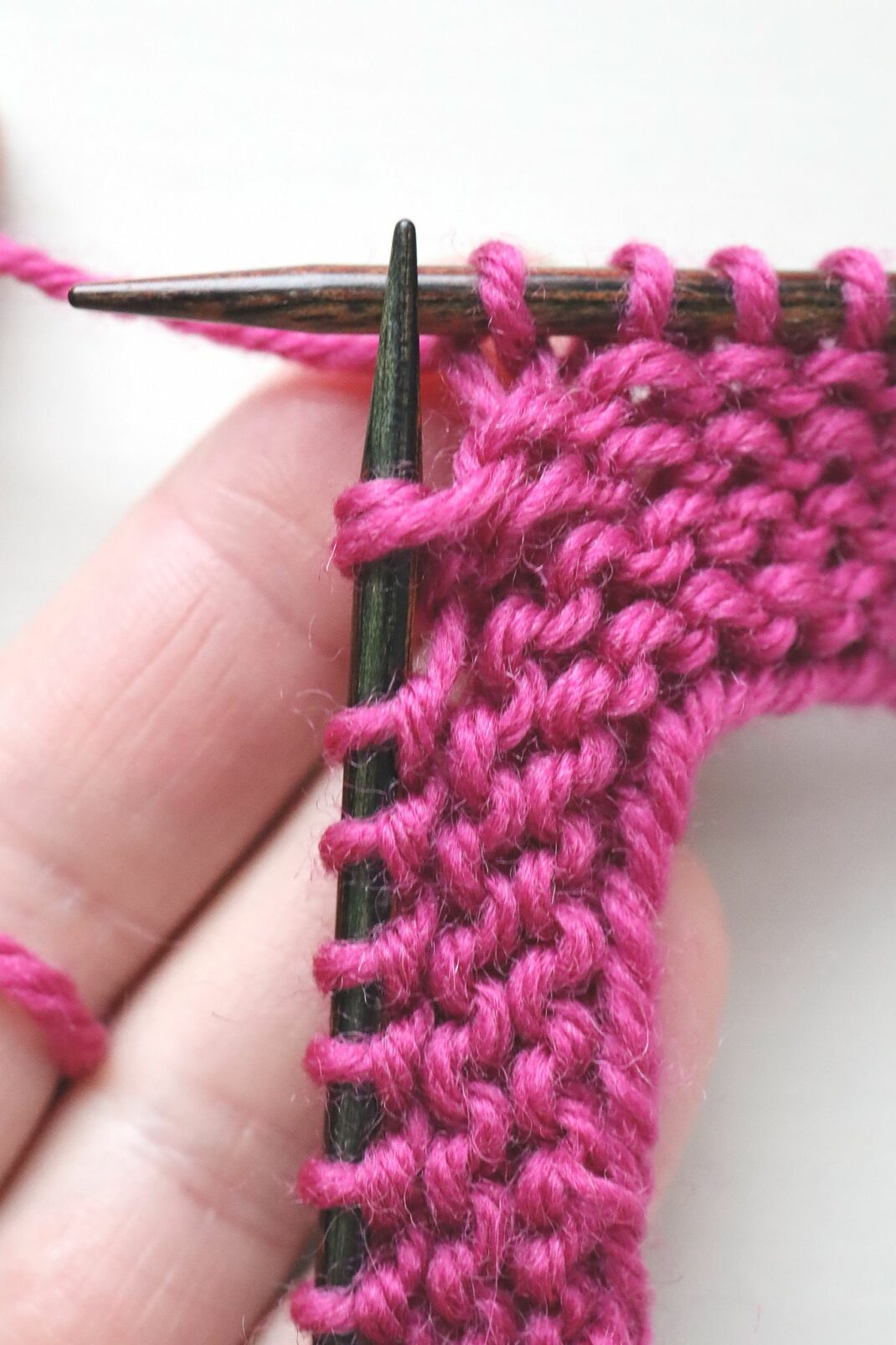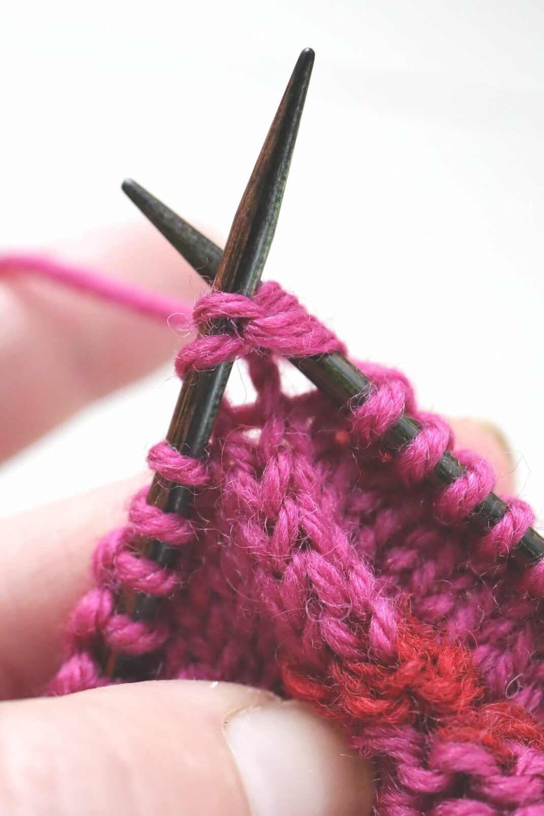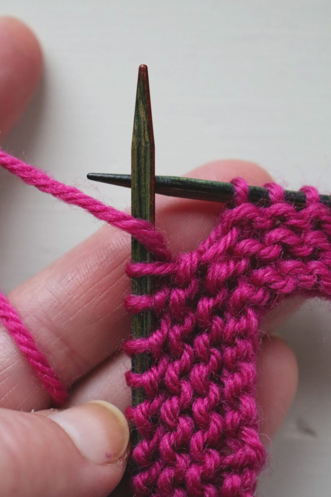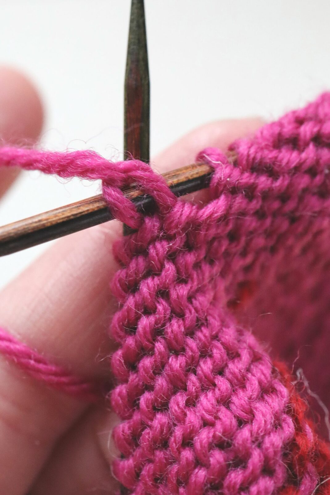 14. På nästa varv syns maskan i vändningen som två maskor, men stickas tillsammans som en maska.