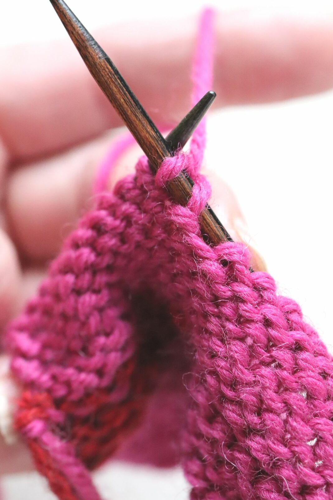 8. I nästa varv stickas maskan vid vändningen tillsammans med garnet intill, det ser ut som två intilliggande maskor, som en enda maska.
