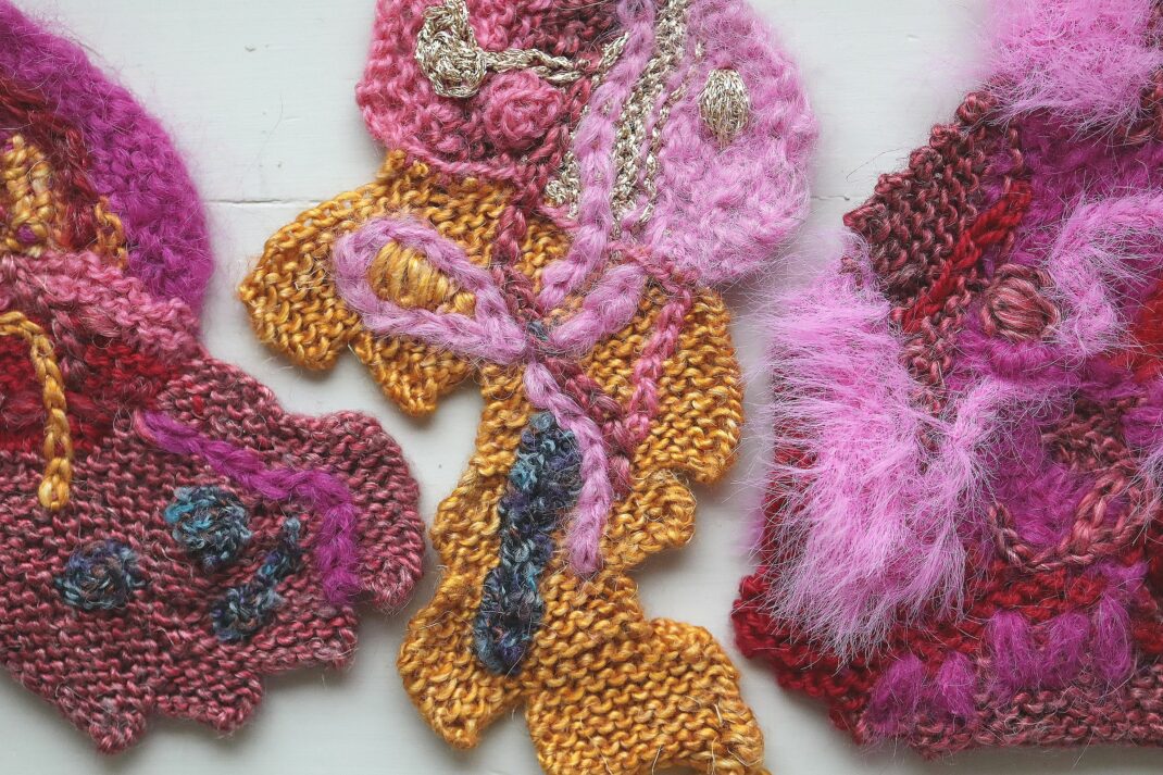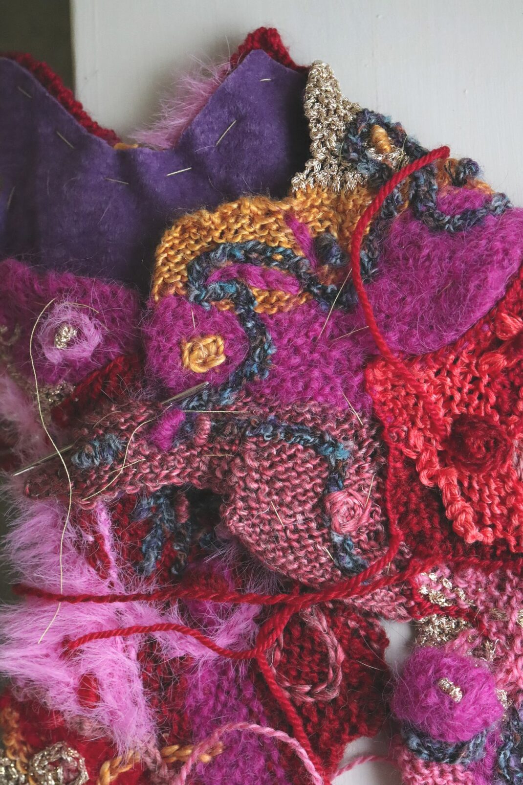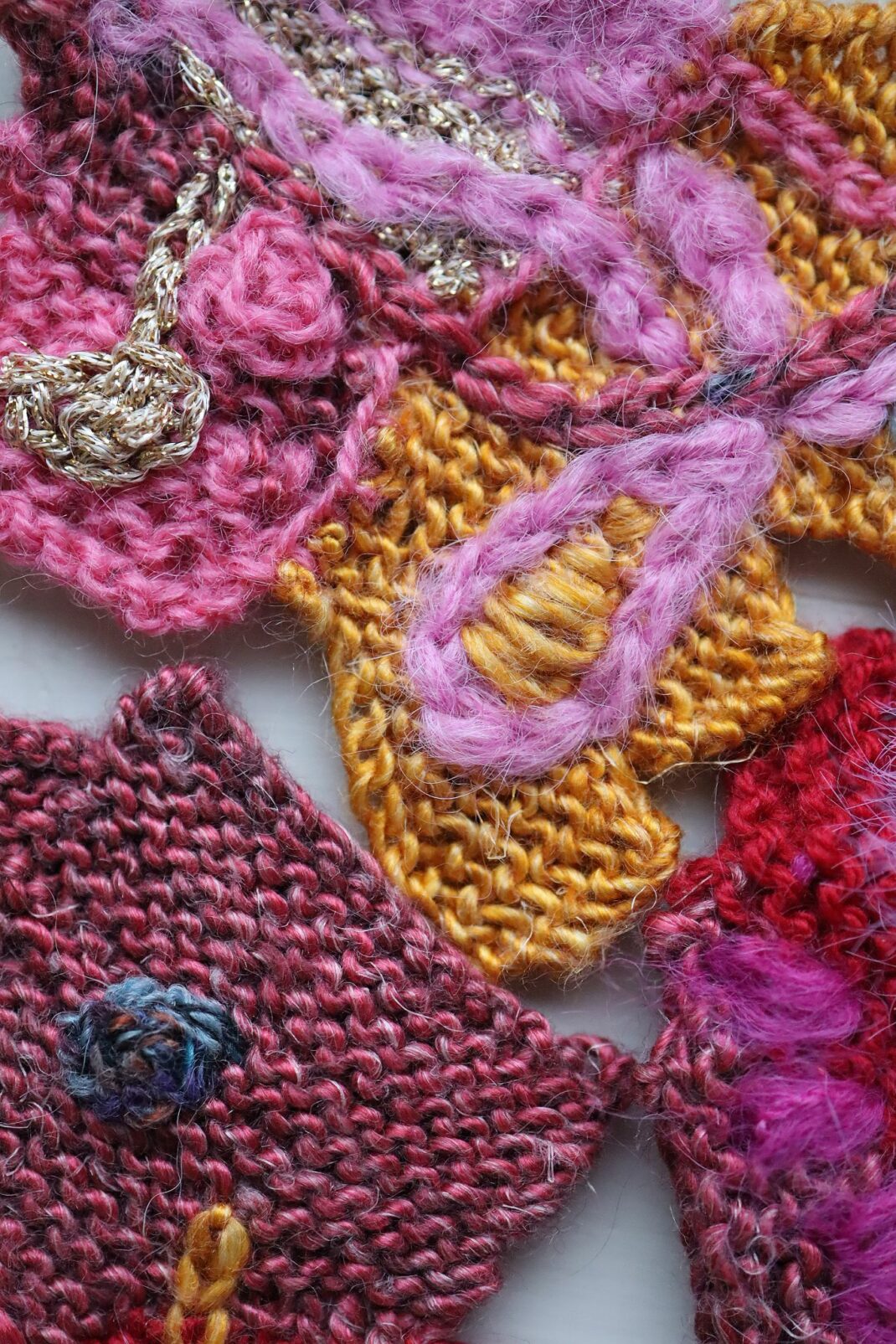 De förkortade varven har kombinerats med många garnbyten och att både öka och minska maskantalet på en mängd sätt. Det skapar krumbukter genom hela arbetet, där delarna formar sig på olika vis.