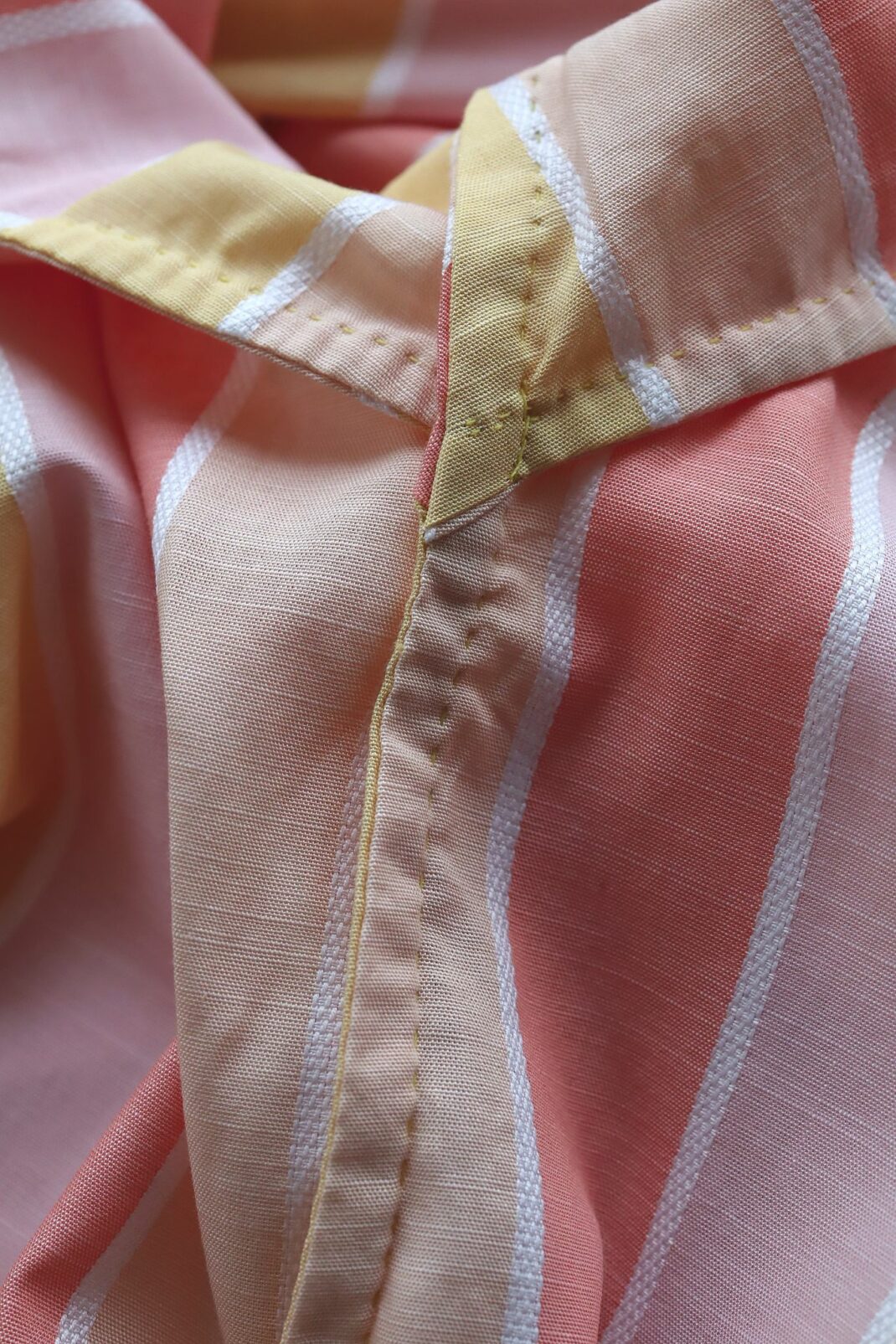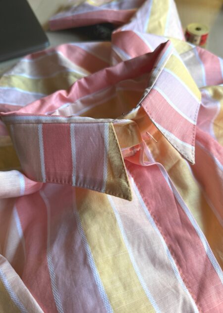 Knappslån på skjortan gjordes dold. Det här är så himla fint och ger skjortan ett lyxigt utseende. Dessutom döljer det mina förstagångs-knapphål. Knappslån är alltså vikt en gång extra och ger en flik som knapparna sitter på, dold av en yttre flik. Det är lätt att göra, bara man följer instruktionerna för hur vikningen ska pressas. Jag har ett tunt skjorttyg till mitt projekt och valde att inte stärka knappslån med vliseline. Jag ångrar det i efterhand, men är inte helt säker på att jag varit nöjd om jag stärkt knappslån heller. Ibland blir man villrådig.