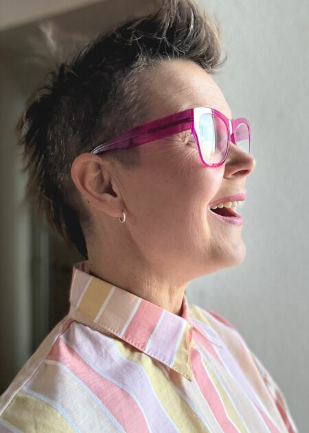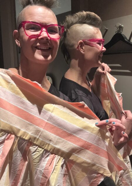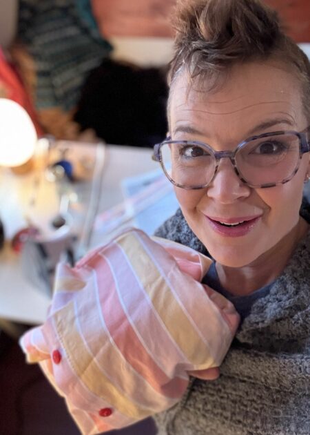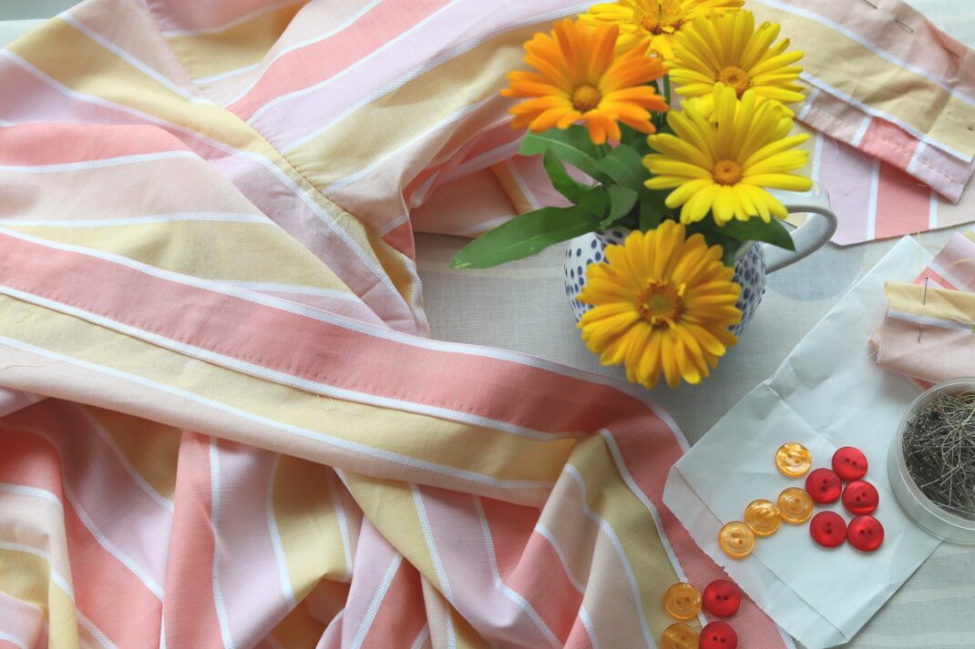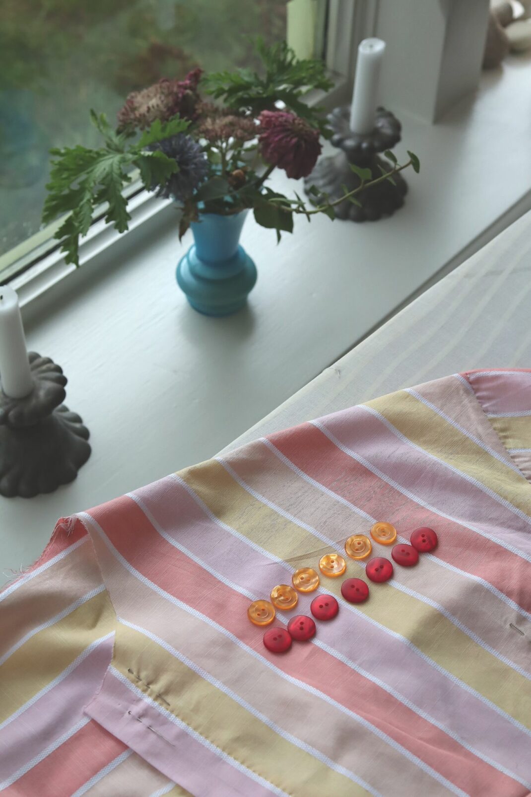 I oktober matchade min mammas sista ringblommor färgerna i min skjorta. Här planerar jag för knappar och knapphål.