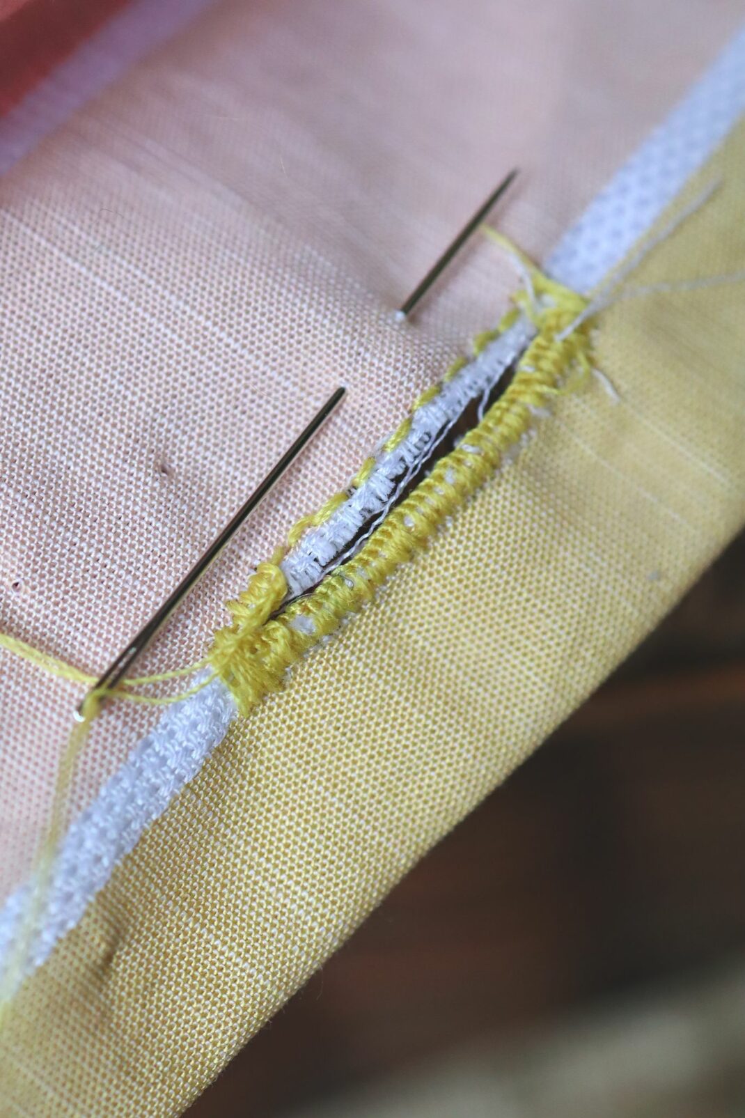 Smal nål - Välj en smal nål med litet huvud, dessa är lätta att arbeta med och glider enkelt upp och ner genom tyget. Om det blir pilligt att sy med liten nål kan du gå upp en storlek. När du sedan pressar tyget, med lite ånga, försvinner "håligheter" efter nålen.