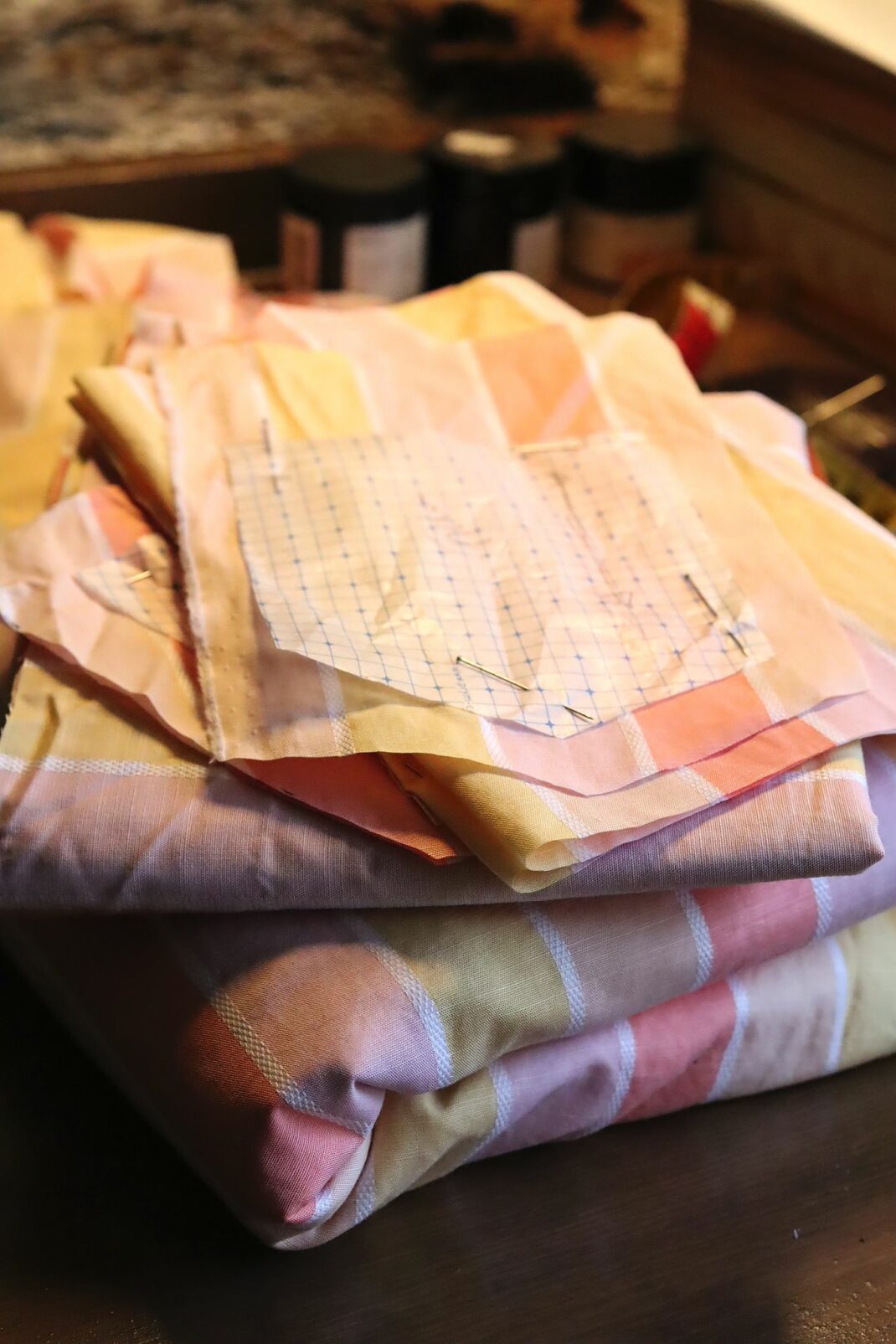 Eftersom jag kommer att sy mitt plagg ytterst långsamt för hand, har jag bara behov av att bära med mig ett fåtal mönsterdelar åt gången. Mina tygdelar kommer att förvaras med pappersmönstret fastnålat på, så jag lätt kan uppdatera mig om info och inte behöver leta upp allt från början.