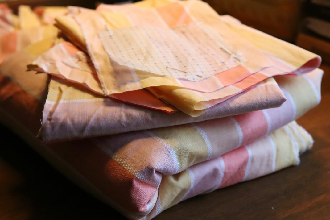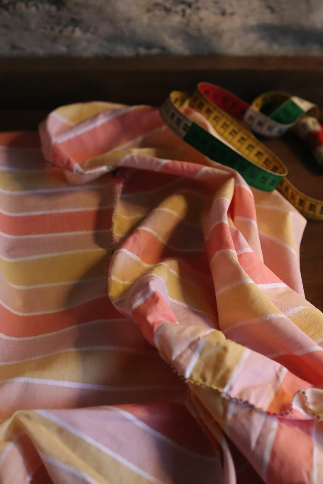 Jag har köpt ett vackert skjorttyg från en tygbutik som säljer deadstock-tyger. Det är tyger som används inom kommersiell tillverkning och som blivit över. Tyget säljs då till tygbutiker för att komma till nytta. Mitt tyg är ett randigt tunt skjorttyg i aprikos, rosa, gult och vitt. Jag älskar det! Materialet är 100% bomull.