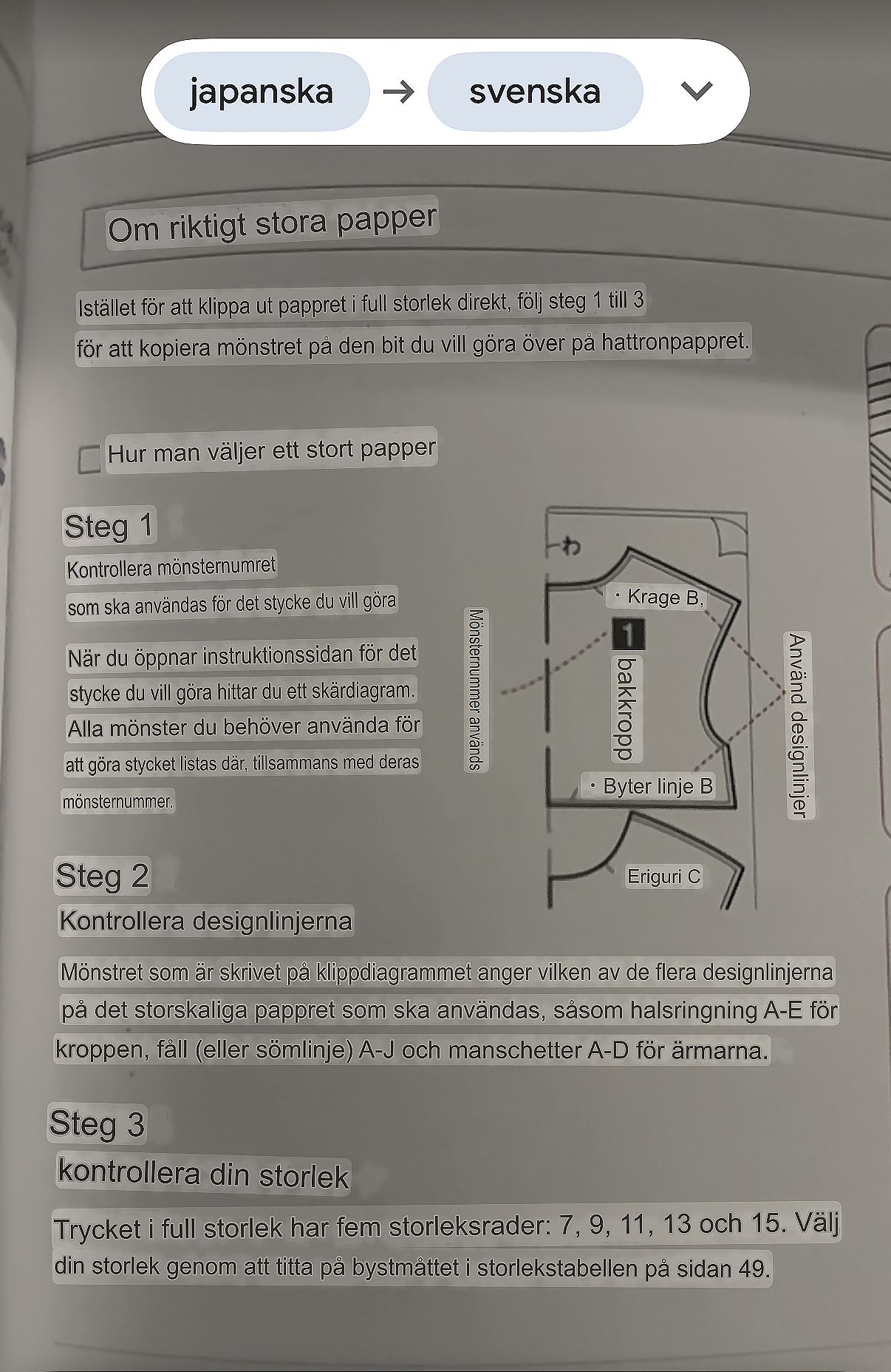 De olika anvisningarna i sybeskrivningen översätts med Google Translates kamerafunktion. Det kan dock bli jättekonstiga översättningar, så det är bra med lite erfarenhet tror jag.