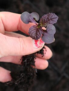 Salladskålen är bredsådd i en liten kruka och de enskilda plantorna dras försiktigt isär och planteras en och en i egna krukor.