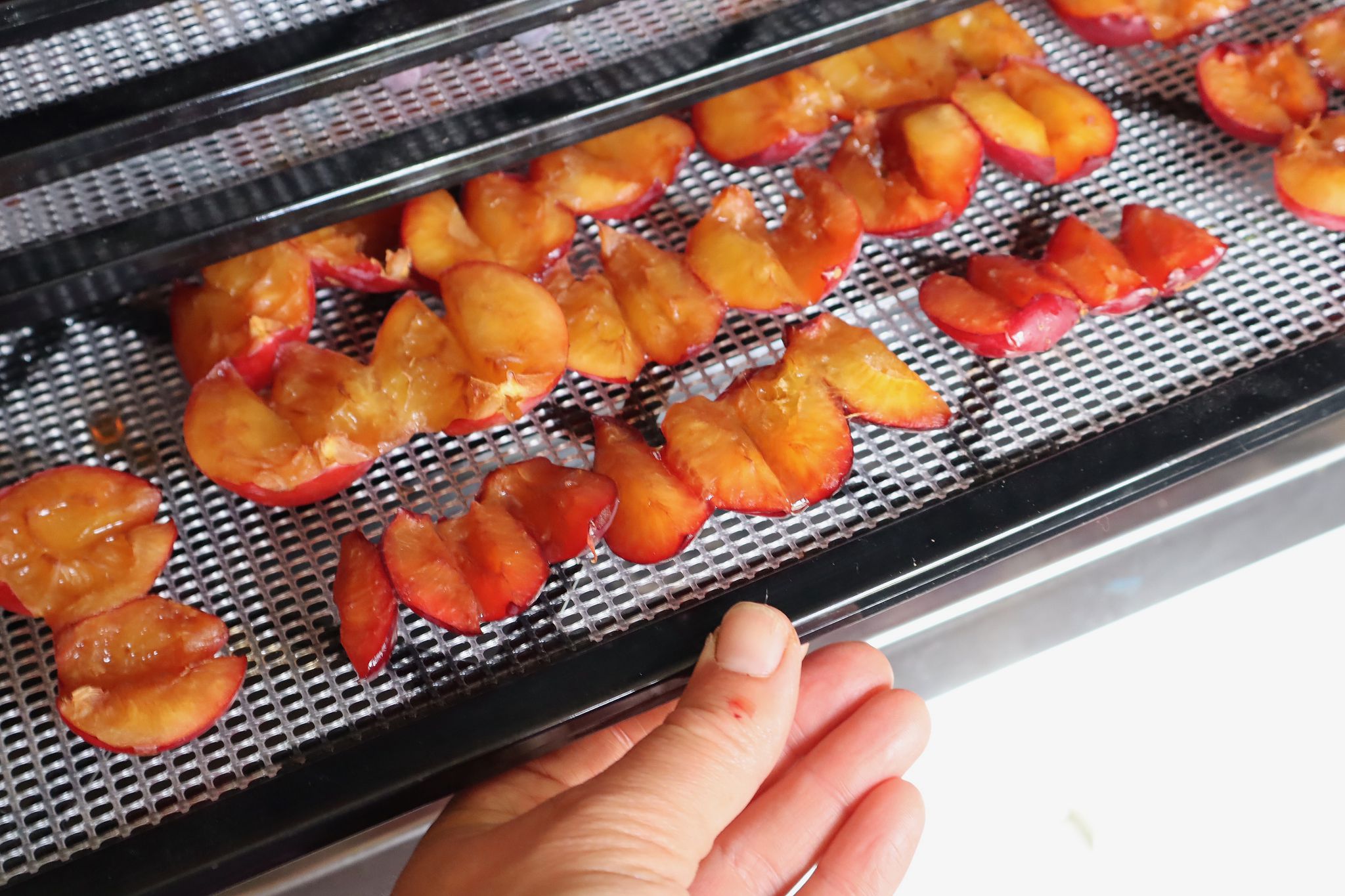 Plommon kan torkas hela, i halvor, skurna i småbitar och mixade till mos. Här på en torkbricka i min torkapparat.