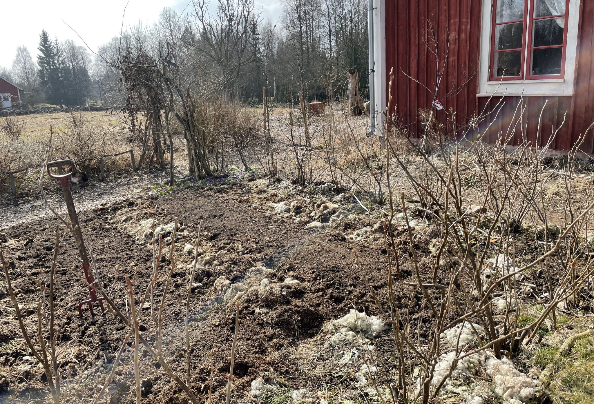 27. mars 2021Årets lök växer bland annat i bädden längst bort mot vinbärsbuskarna, i en ny bädd jag krattat i ordning här i kvarteret.