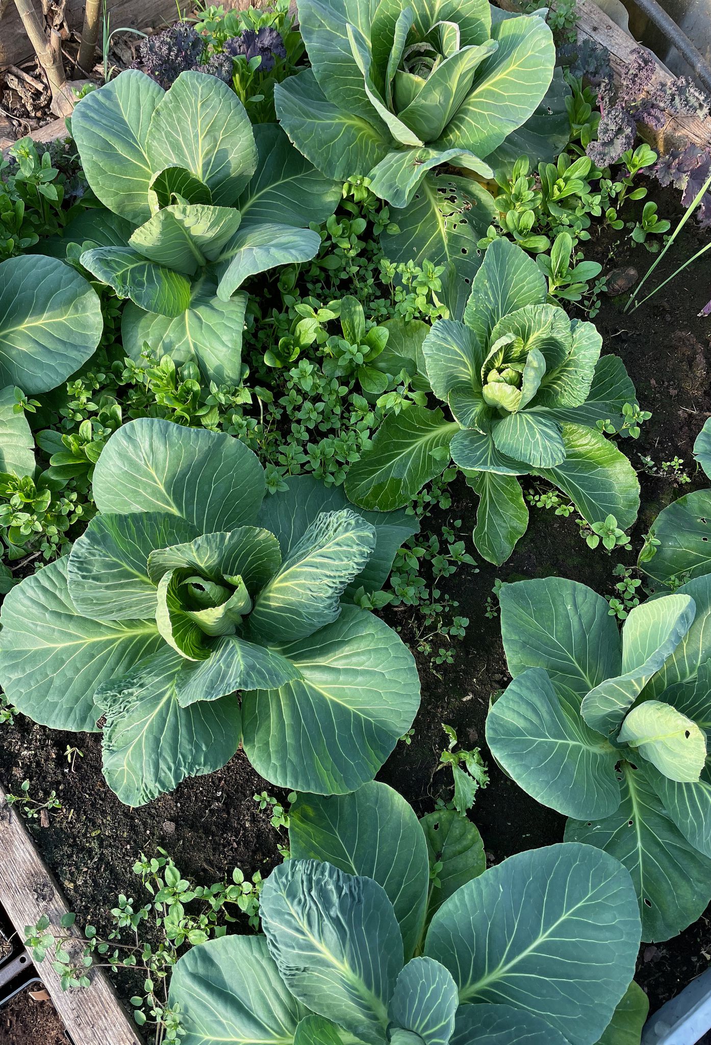 Det är totalt åtta kålplantor, de växer i ett hörn i en bädd i mitt stora tunnelväxthus.