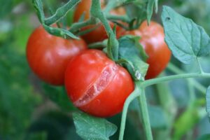 Ibland händer det att tomaterna spricker när de hänger på plantan. Oftast är det den mest mogna tomaten på klasen som får en spricka i skalet.
