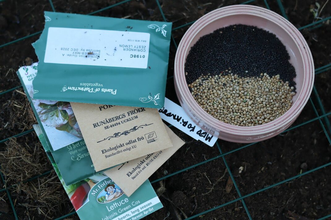 Sådden görs med fröer som för länge sedan passerat sista försäljningsdatum och som jag bedömer har dålig grobarhet. Jag blandar fröerna och tar extra mycket, eftersom jag räknar med att en del kanske inte gror. Sättet jag sår på är förlåtande och det kommer inte att märkas att några fröer inte ger resultat. Det är bättre att använda fröerna till den här sådden, än att odla dem i pluggbrätten, rader eller krukor där ett sämre resultat syns tydligare.