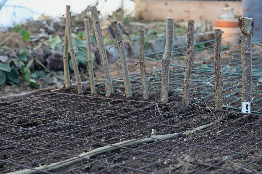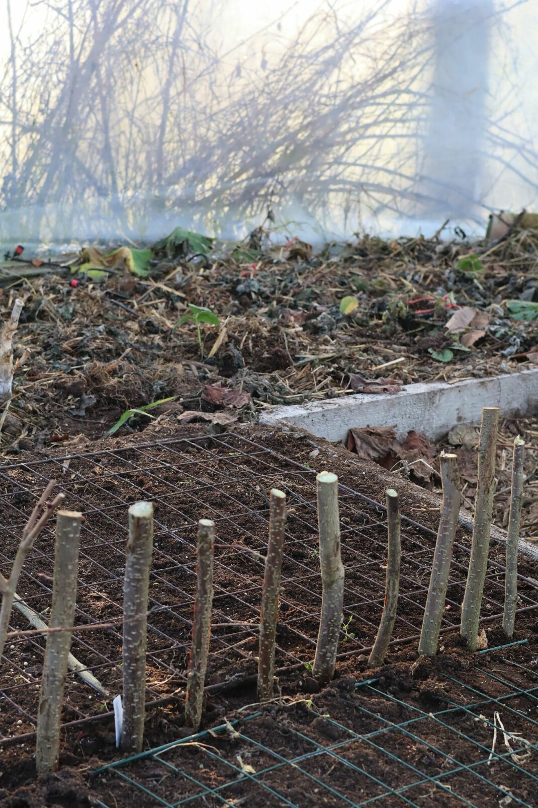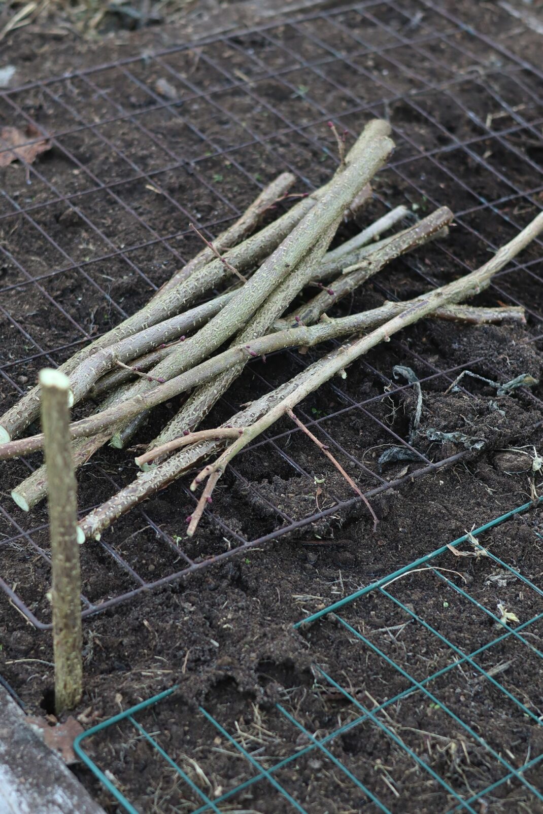 Jag ska så en plätt lika stor som ett kompostgaller, för att kunna täcka ytan just med ett kompostgaller och skydda jorden från att katterna krafsar. Som avgränsare, bara för att det blir fint, gör jag ett mini-staket av hasselkvistar som jag klippt i några decimeter långa bitar. Det blir en snygg fond sedan när jag förhoppningsvis får fotografera resultatet av sådden i vår.