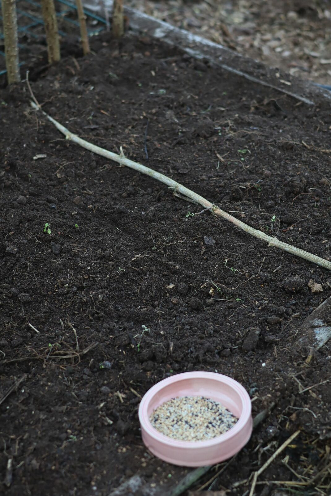 Sådden krafsas försiktigt ner i jorden och jorden plattas till så att fröerna omsluts av jord. Därefter lägger jag ett kompostgaller på jorden.