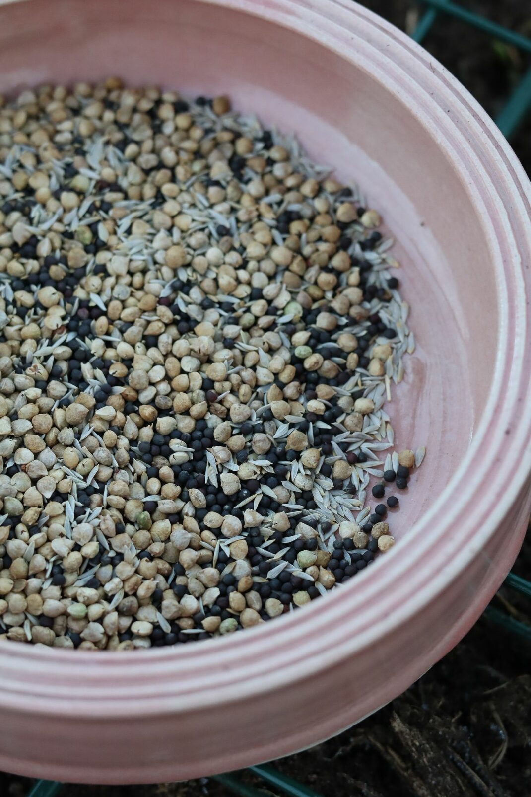 Alla fröerna blandas i en skål och sås tillsammans som en mix.