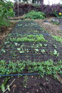 Efter att potatis skördats har jag tagit bort täckmaterial, rensat, grävt ner bokashi-kompost och sått arton korta rader med nya grönsaker. Närmast i bild växer smörgåskrasse.