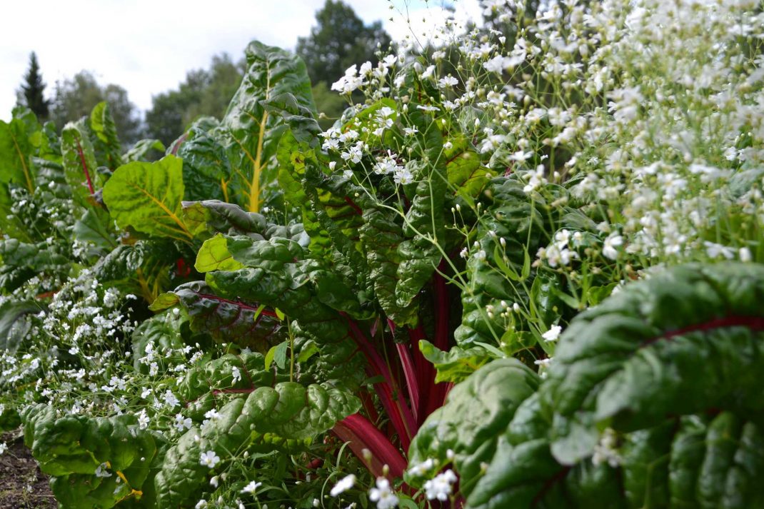 I juli har mangolden vuxit ordentligt och den vackra sommarslöjan blommar fint mellan plantorna.