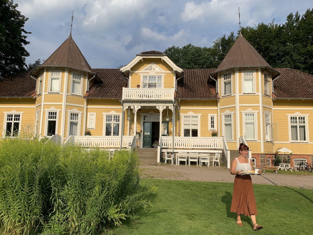 Frukost i en soldränkt trädgård på Villa Söderåsen.