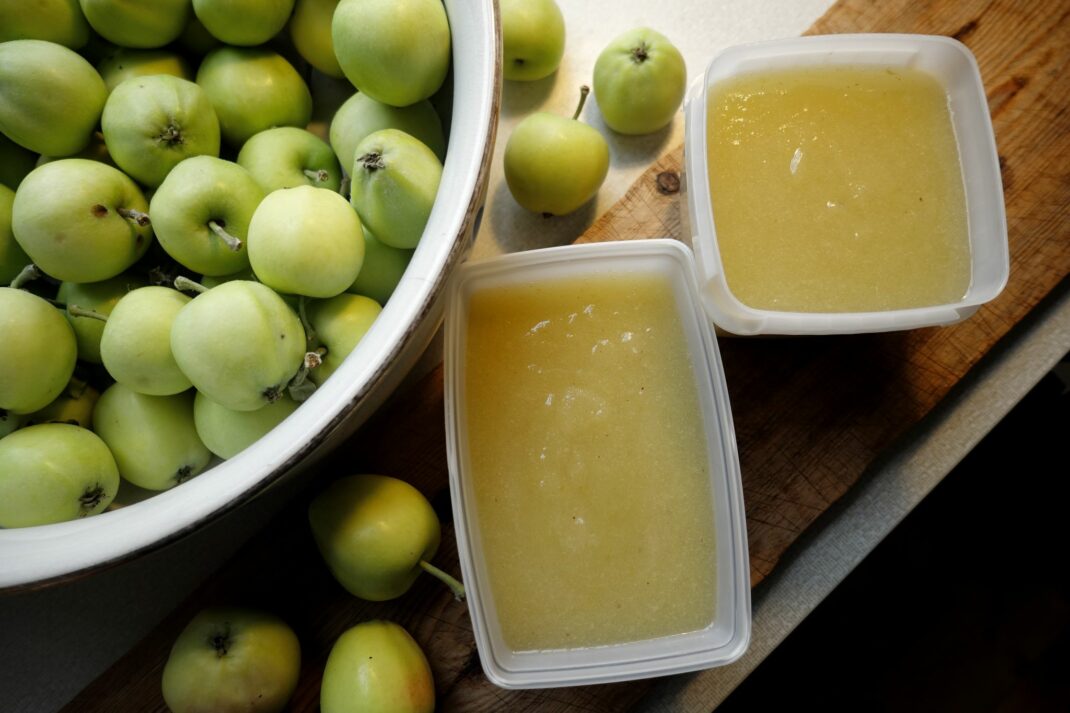 De små och något omogna äpplena från tidiga sorten 'Transparent Blanche' är utmärkta till sommarens första äppelmos.