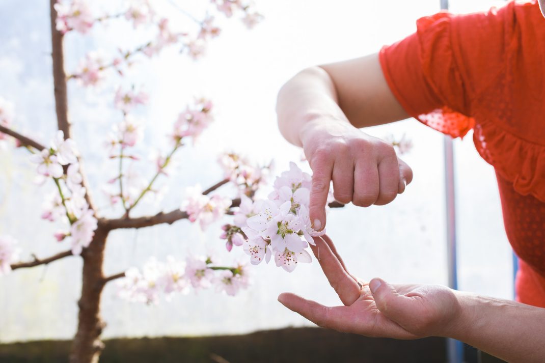 När persikoträden blommar är det dags att pollinera. Jag använder fingret för att flytta runt pollen mellan blommorna, istället för pensel.