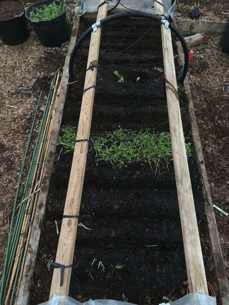 Sallat kan gro när jorden är bara fyra grader varm (eller kall beroende på hur man ser det, förstås). Just nu låter jag bädden stå som den är, men som du ser har jag en minitunnel här som jag kan arrangera när det blir kallare. Det är suveränt! Varje lager jag kan lägga över växterna på vinter ökar möjligheterna att skydda växter och fröer från allt för hård kyla som riskerar att förstöra dem.